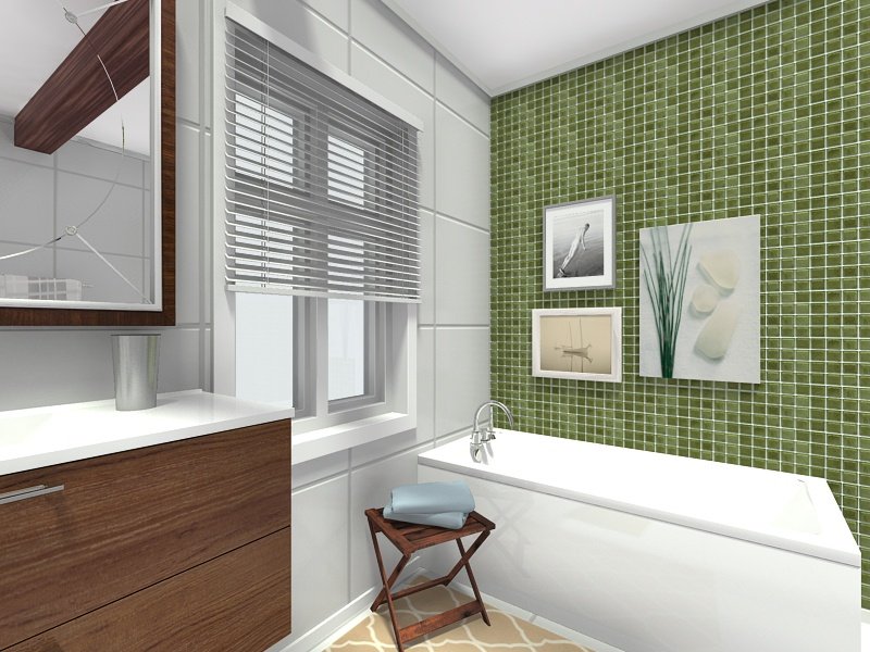 Adding an accent tile is a great way to update a bathroom. Choose one wall to be the focal point for your room. For bathrooms, the back wall tends to be the best. Add a colored mosaic or patterned tile. In this room, we used a green mosaic tile to evoke nature and to complement the wood finish on the vanity.